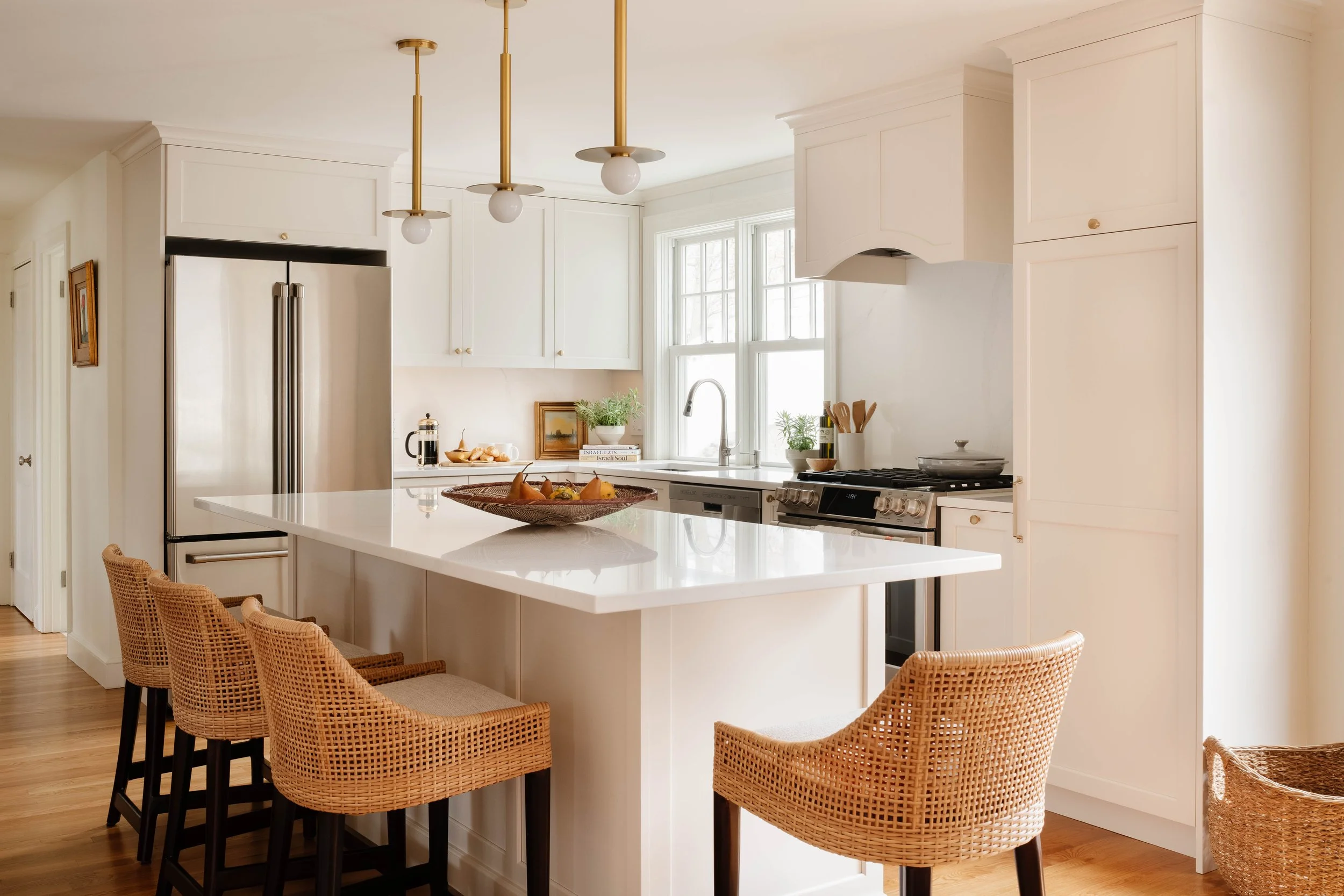 North Shore magazine called it "Small but Mighty". Justine's retired clients wanted a complete renovation of their Cape style home in Melrose, MA along with an addition to add much needed square footage to enhance the first floor plan and carve out more space for a mudroom, relaxing, cooking and entertaining. A timeless clean palette with contemporary accents and layers of texture paired perfectly with the client's Eastern influenced art collection to create a home that they can enjoy along with visiting children and grandchildren.