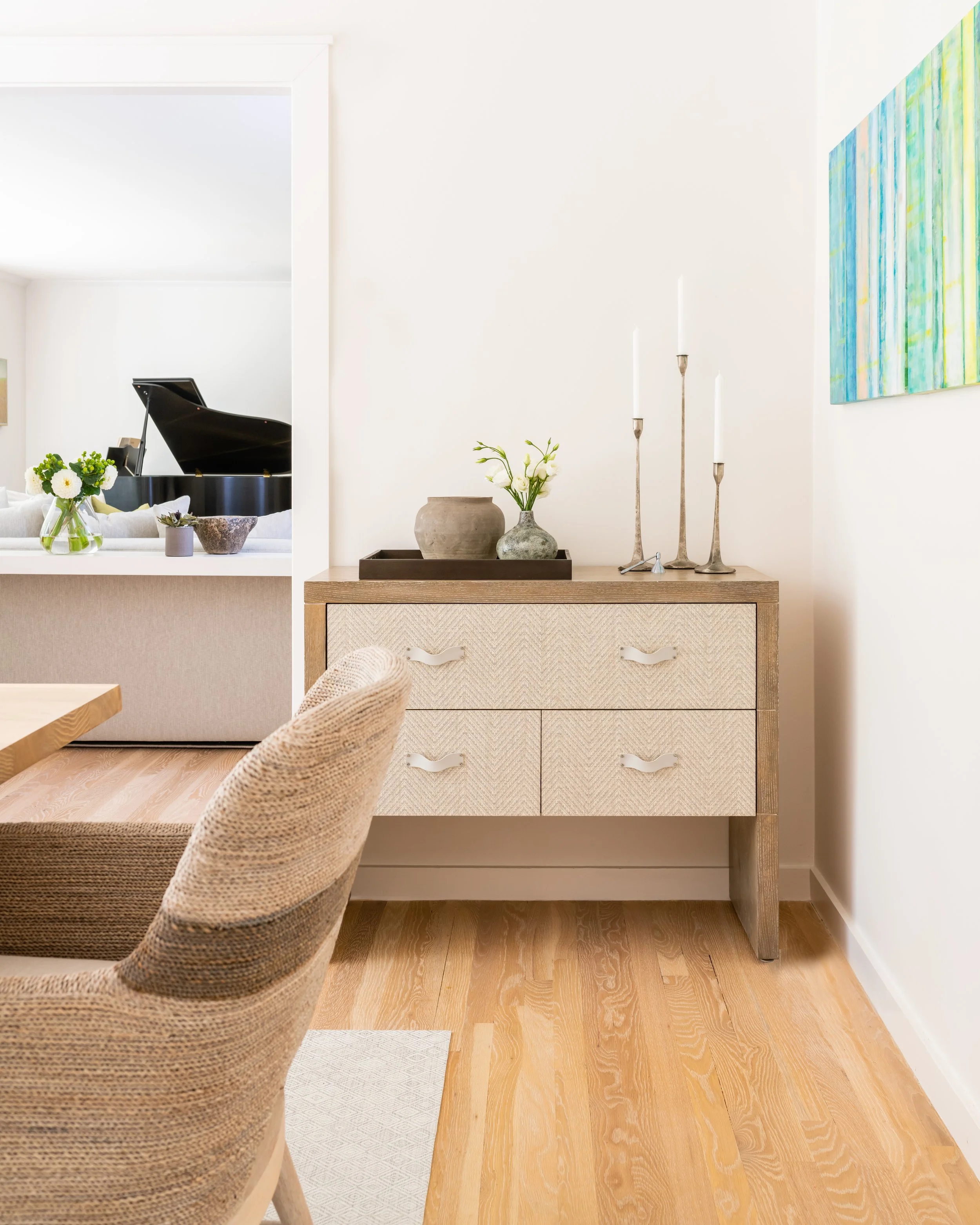 When this family of four contacted us to work our magic on their space planning and aesthetic dilemma’s, we took some cue’s from the gorgeous green gardens and their love of neutrals and textures. It seems to be a trend with our clients that many do not want any tv in their main family rooms, and we embraced that fully. We maximized their seating with a large low slung sectional and additional sculptural ottomans to use as pull up seats when entertaining. Sculptural wall sconces were added to the mantel wall to create a glow and interest to this focal point. The large piano had to find a home here too, and it fits snugly into the corner. It is flanked on the opposite wall by two large tall storage units that house games and homework for their two young daughters.